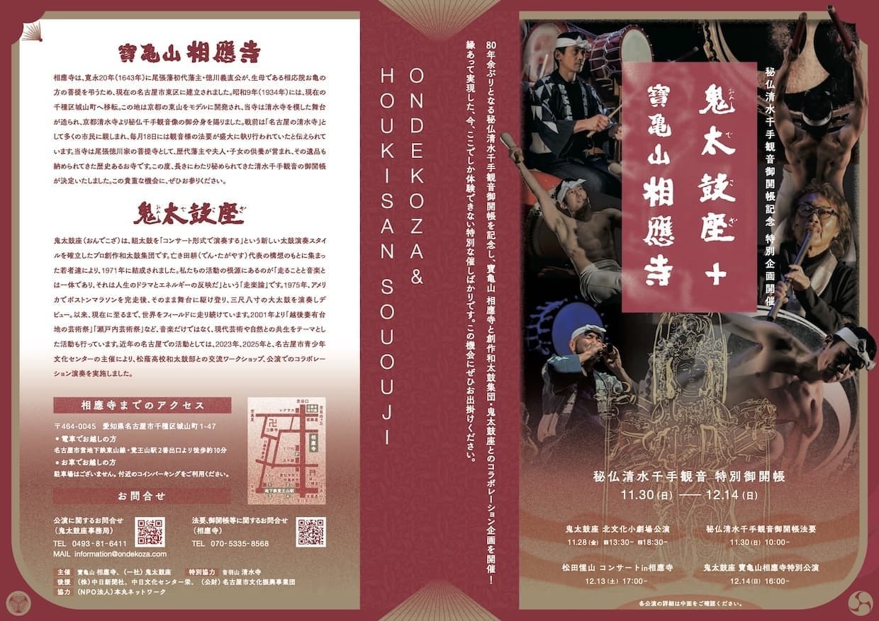80年余ぶりとなる秘仏清水千手観音御開帳を記念し、 寶亀山相應寺と創作和太鼓集団 ・ 鬼太鼓座とのコラボレーション企画を開催します!