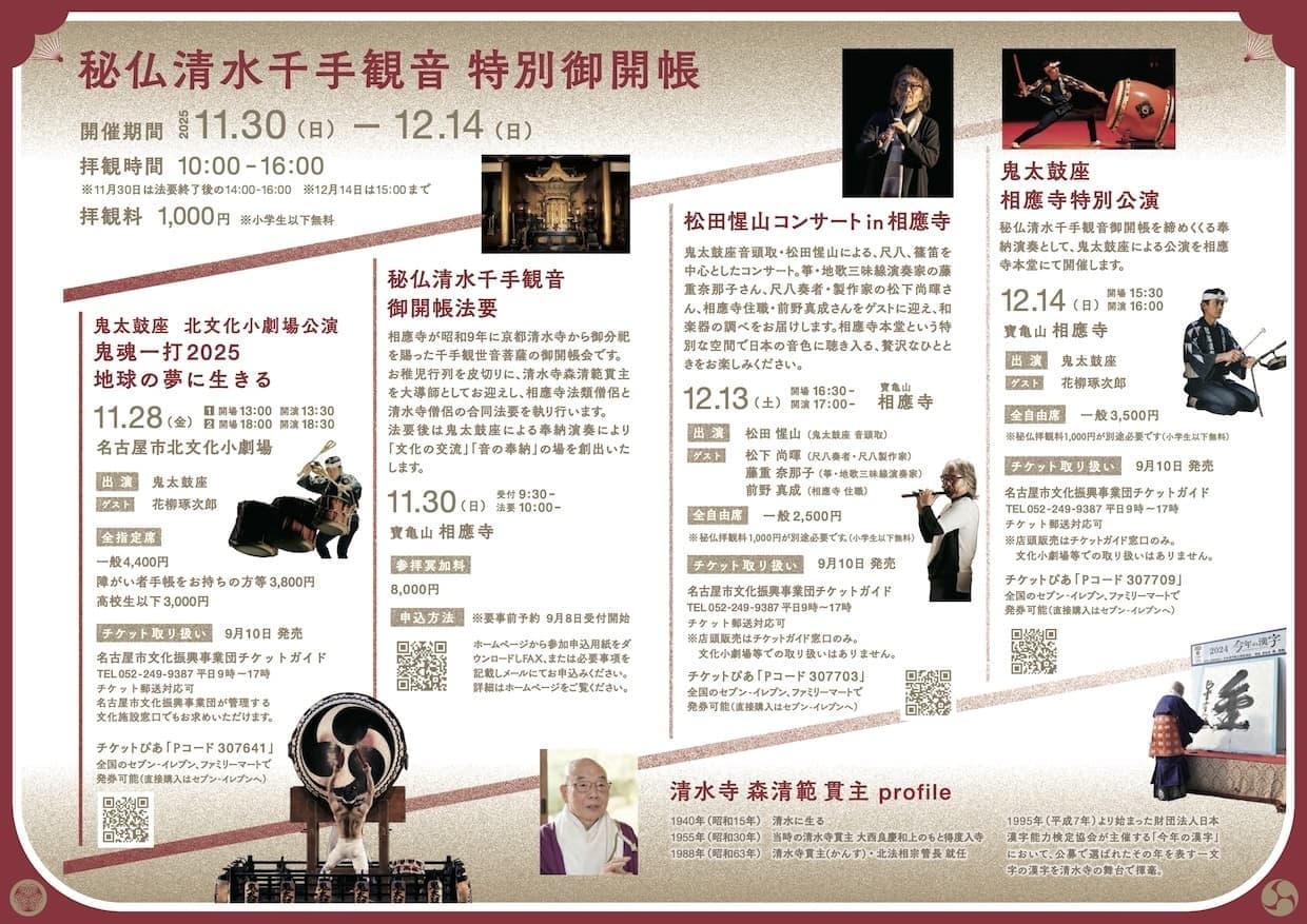 80年余ぶりとなる秘仏清水千手観音御開帳を記念し、 寶亀山相應寺と創作和太鼓集団 ・ 鬼太鼓座とのコラボレーション企画を開催します!